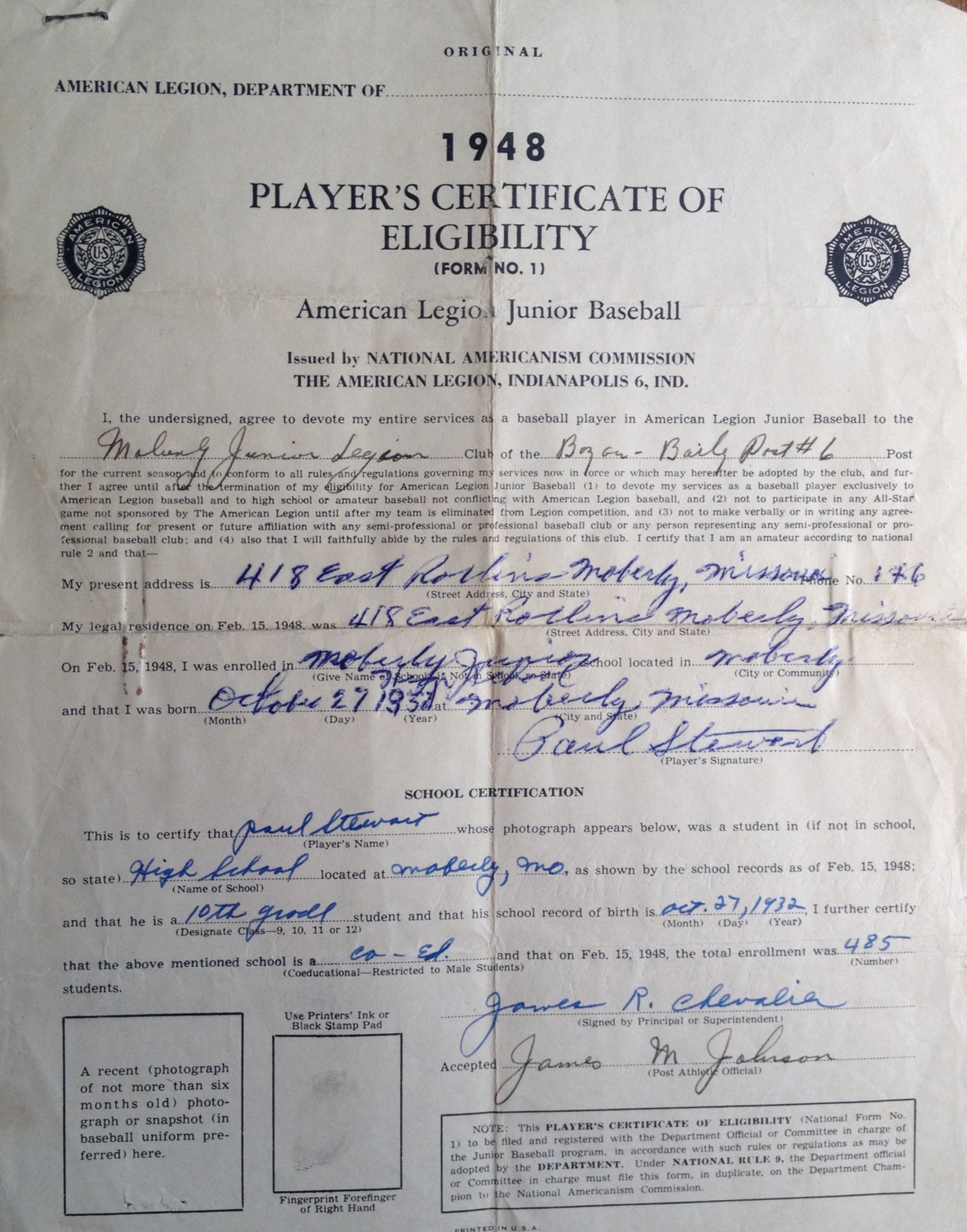 Paul’s American Legion Application